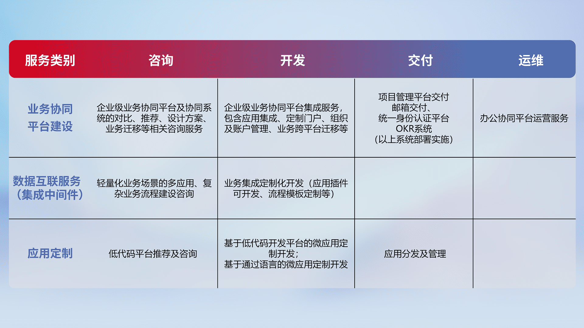 针对钉钉、、、企微、、、IDaas等平台级产品提供产品的规划、、、、方案、、、交付、、、定制化开发等服务,,实现如统一协同办公、、、、智能客户服务、、、混合会议管理、、智能数据查询、、、等业务场景,,实现数字化转型。。。。