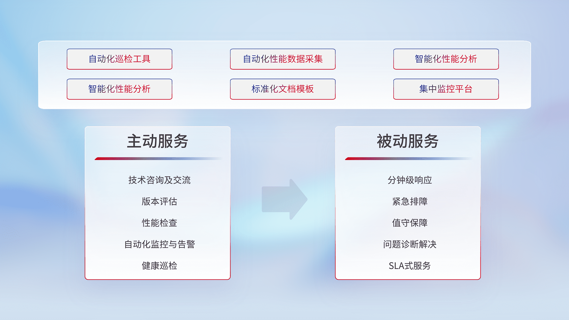 智能化工具和标准化文档,,,保障服务质量,,,,提供主动服务(包含技术咨询、、、、版本评估、、、、性能检查、、、自动化监控与告警、、、、健康巡检)和被动服务包含(分钟级响应、、、、紧急排障、、、、值守保障、、、问题诊断解决、、、SLA服务)。。
